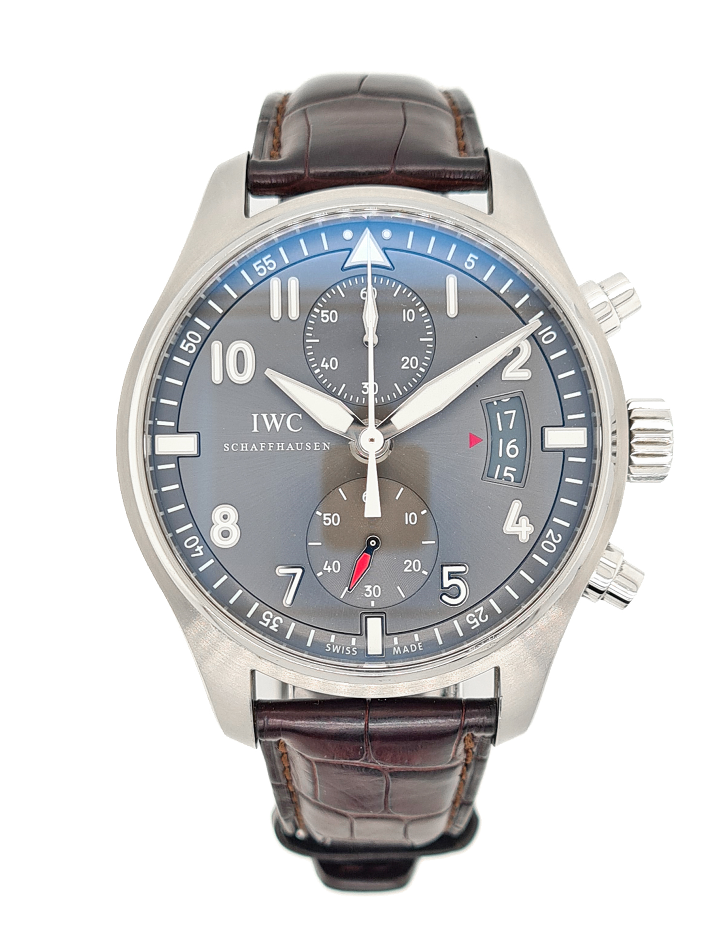 Diese spezifische IWC Pilot's Spitfire IW387802 hat ein grau arabisch ziffernblatt mit einem leder armband. Diese IWC wurde in unserem IWC-zertifizierten Servicecenter einer gründlichen Prüfung der Genauigkeit, Funktionalität und des Zustands unterzogen, um den Grad der Überholung zu bestimmen, der zur Einhaltung unserer strengen Standards erforderlich ist. Sie wurde auch mit unseren Unterlagen verglichen, um die Echtheit zu gewährleisten. Zu Ihrer Sicherheit verfügen alle unsere Uhren über eine 24-monatige Garantie.