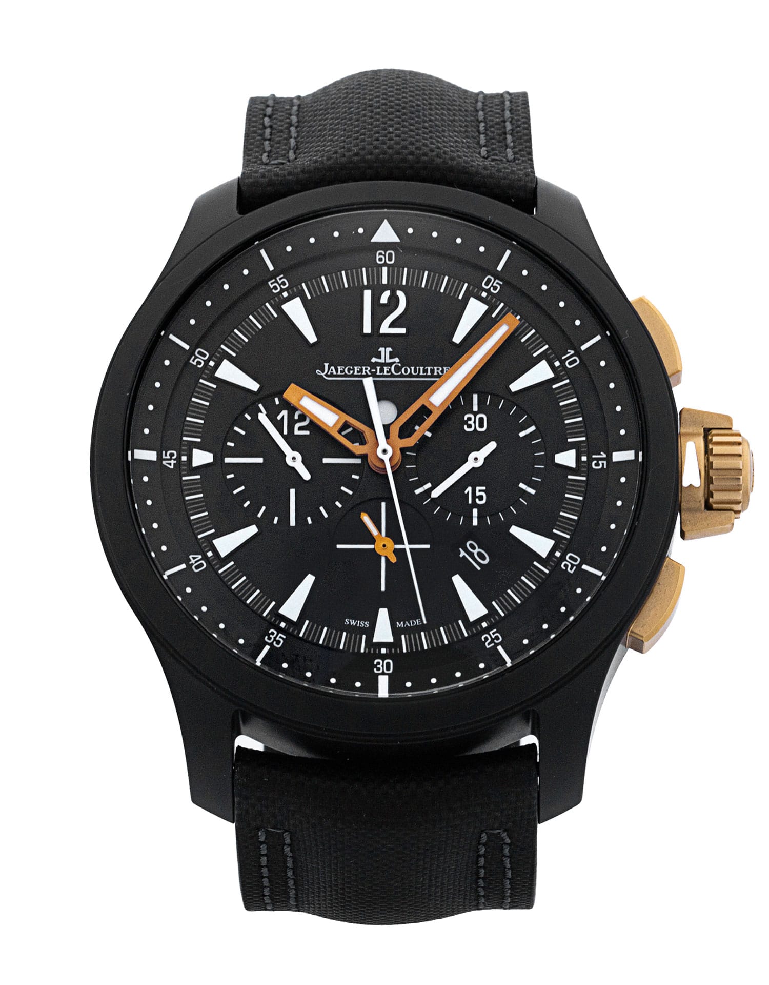 Diese spezifische Jaeger-LeCoultre Master Compressor Chronograph 205L570 hat ein schwarz baton ziffernblatt mit einem stoff armband. Diese Jaeger-LeCoultre wurde in unserem Jaeger-LeCoultre-zertifizierten Servicecenter einer gründlichen Prüfung der Genauigkeit, Funktionalität und des Zustands unterzogen, um den Grad der Überholung zu bestimmen, der zur Einhaltung unserer strengen Standards erforderlich ist. Sie wurde auch mit unseren Unterlagen verglichen, um die Echtheit zu gewährleisten. Zu Ihrer Sicherheit verfügen alle unsere Uhren über eine 24-monatige Garantie.