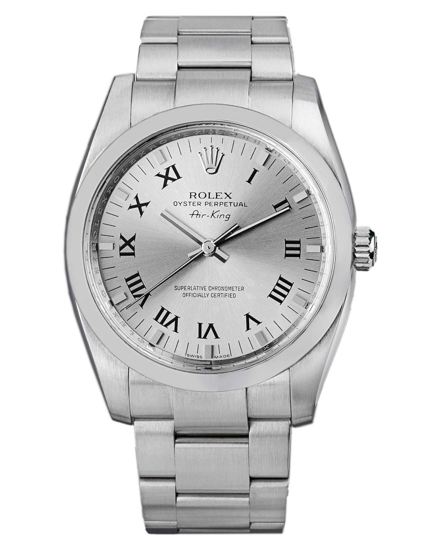 Diese spezifische Rolex Air-King 114200 hat ein silber römische ziffern ziffernblatt mit einem metall / keramik armband. Diese Rolex wurde einer gründlichen Prüfung der Wasserbeständigkeit, Genauigkeit, Funktionalität und des Zustands unterzogen, um den Grad der Überholung zu bestimmen, der zur Einhaltung unserer strengen Standards erforderlich ist. Sie wurde auch mit technischen Dokumenten und Herstelleraufzeichnungen verglichen, falls vorhanden, um Echtheit und einen einwandfreien Werdegang zu gewährleisten. Zu Ihrer Sicherheit verfügen alle unsere Uhren über eine 24-monatige Garantie. Einer unserer Poliertechniker hat die durch tägliche Abnutzung entstandenen Makel auf dem Gehäuse und dem Armband dieser Uhr entfernt, weshalb diese Uhr nicht mit der verbleibenden Herstellergarantie geliefert wird.