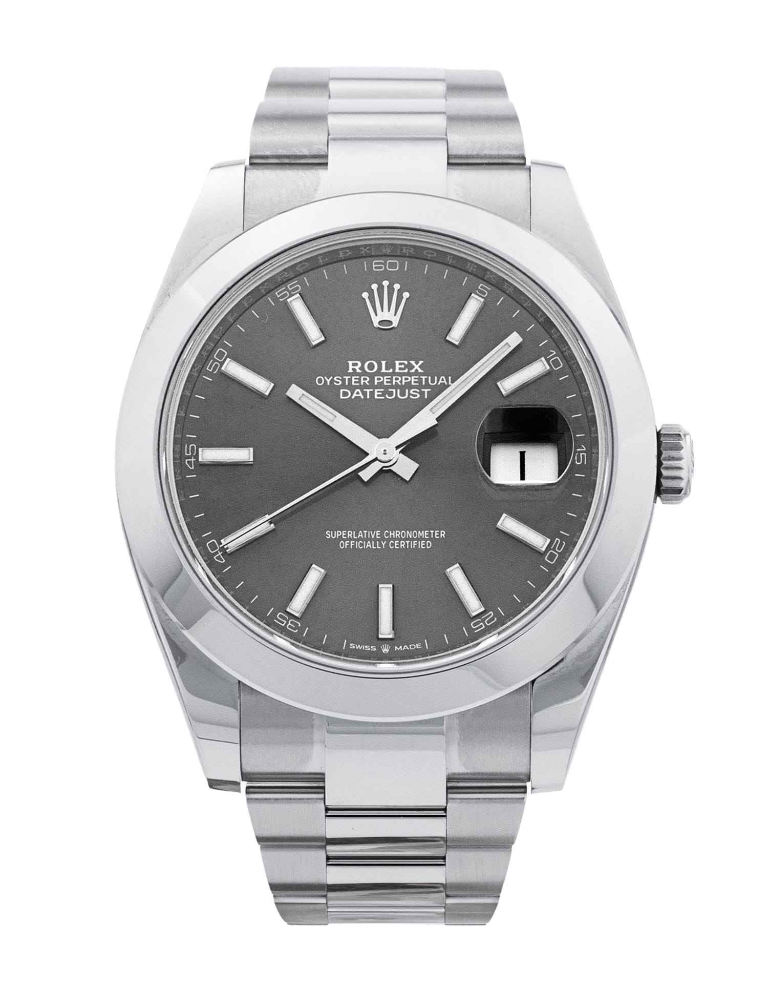 Diese spezifische Rolex Datejust 41 126300 hat ein schiefer baton ziffernblatt mit einem metall / keramik armband. Diese Rolex wurde einer gründlichen Prüfung der Wasserbeständigkeit, Genauigkeit, Funktionalität und des Zustands unterzogen, um den Grad der Überholung zu bestimmen, der zur Einhaltung unserer strengen Standards erforderlich ist. Sie wurde auch mit technischen Dokumenten und Herstelleraufzeichnungen verglichen, falls vorhanden, um Echtheit und einen einwandfreien Werdegang zu gewährleisten. Zu Ihrer Sicherheit verfügen alle unsere Uhren über eine 24-monatige Garantie. Einer unserer Poliertechniker hat die durch tägliche Abnutzung entstandenen Makel auf dem Gehäuse und dem Armband dieser Uhr entfernt, weshalb diese Uhr nicht mit der verbleibenden Herstellergarantie geliefert wird.