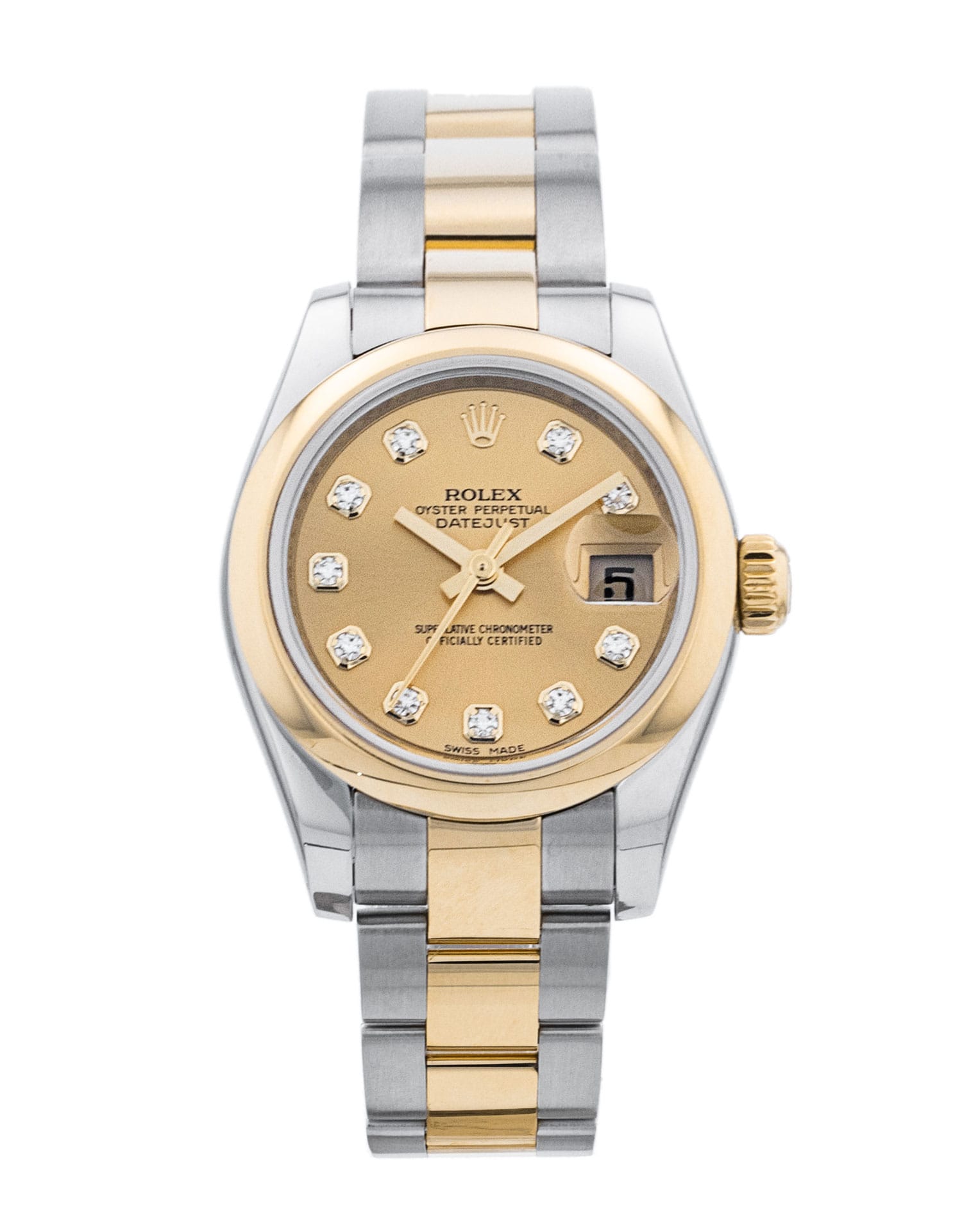 Diese spezifische Rolex Datejust Lady 179163 hat ein champagner diamant ziffernblatt mit einem metall / keramik armband. Diese Rolex wurde einer gründlichen Prüfung der Wasserbeständigkeit, Genauigkeit, Funktionalität und des Zustands unterzogen, um den Grad der Überholung zu bestimmen, der zur Einhaltung unserer strengen Standards erforderlich ist. Sie wurde auch mit technischen Dokumenten und Herstelleraufzeichnungen verglichen, falls vorhanden, um Echtheit und einen einwandfreien Werdegang zu gewährleisten. Zu Ihrer Sicherheit verfügen alle unsere Uhren über eine 24-monatige Garantie. Einer unserer Poliertechniker hat die durch tägliche Abnutzung entstandenen Makel auf dem Gehäuse und dem Armband dieser Uhr entfernt, weshalb diese Uhr nicht mit der verbleibenden Herstellergarantie geliefert wird.