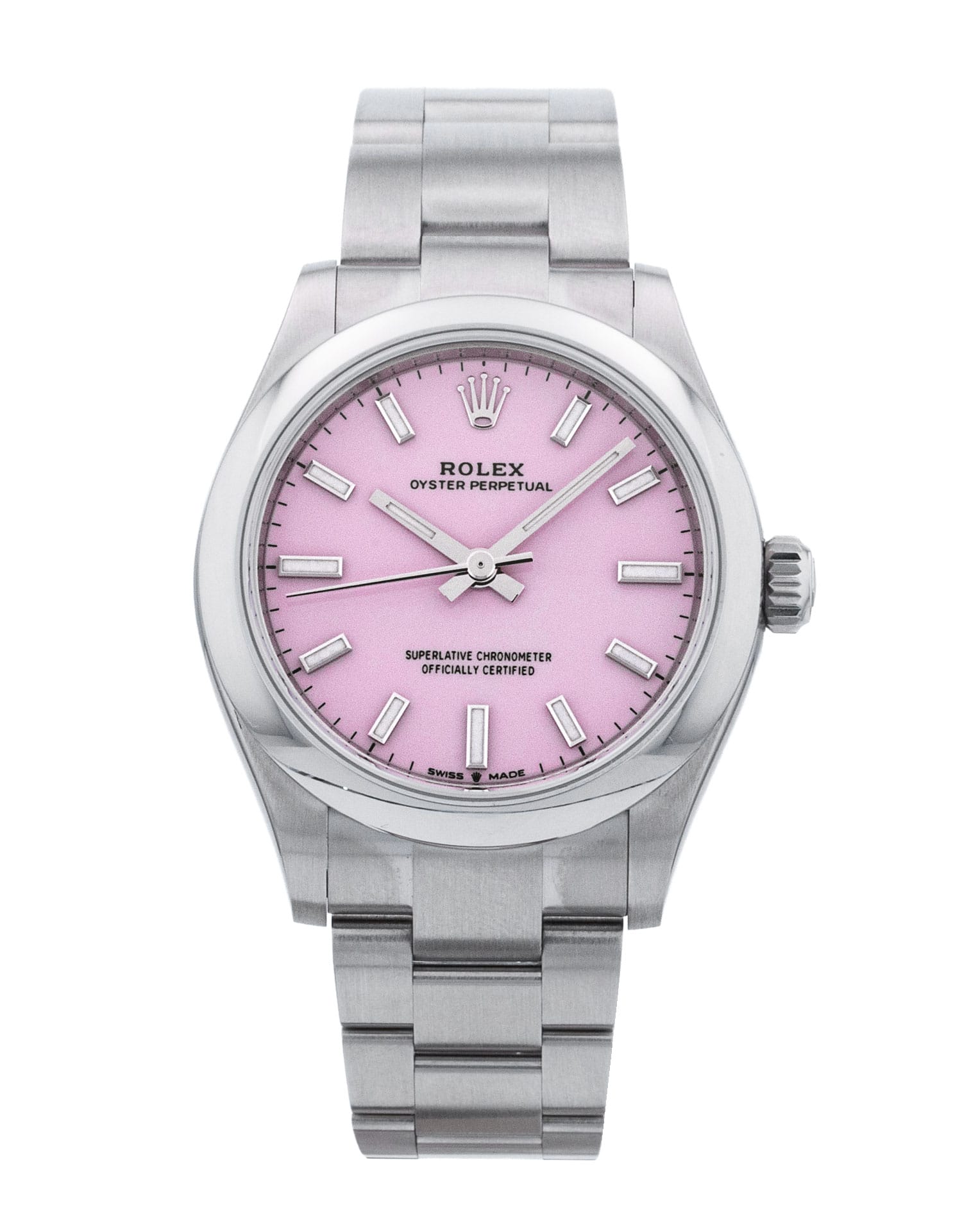 Diese spezifische Rolex Oyster Perpetual 277200 hat ein rosa baton ziffernblatt mit einem metall / keramik armband. Diese Rolex wurde einer gründlichen Prüfung der Wasserbeständigkeit, Genauigkeit, Funktionalität und des Zustands unterzogen, um den Grad der Überholung zu bestimmen, der zur Einhaltung unserer strengen Standards erforderlich ist. Sie wurde auch mit technischen Dokumenten und Herstelleraufzeichnungen verglichen, falls vorhanden, um Echtheit und einen einwandfreien Werdegang zu gewährleisten. Damit Sie sich auf unsere Uhren verlassen können, gewähren wir Ihnen eine 24-monatige Garantie. Diese gilt in Verbindung mit jeder eventuell noch bestehenden Herstellergarantie für Neuwaren oder Serviceleistungen. Um die Herstellergarantie für diese Uhr nicht verfallen zu lassen, wurde sie in unserem Servicecenter nicht poliert.