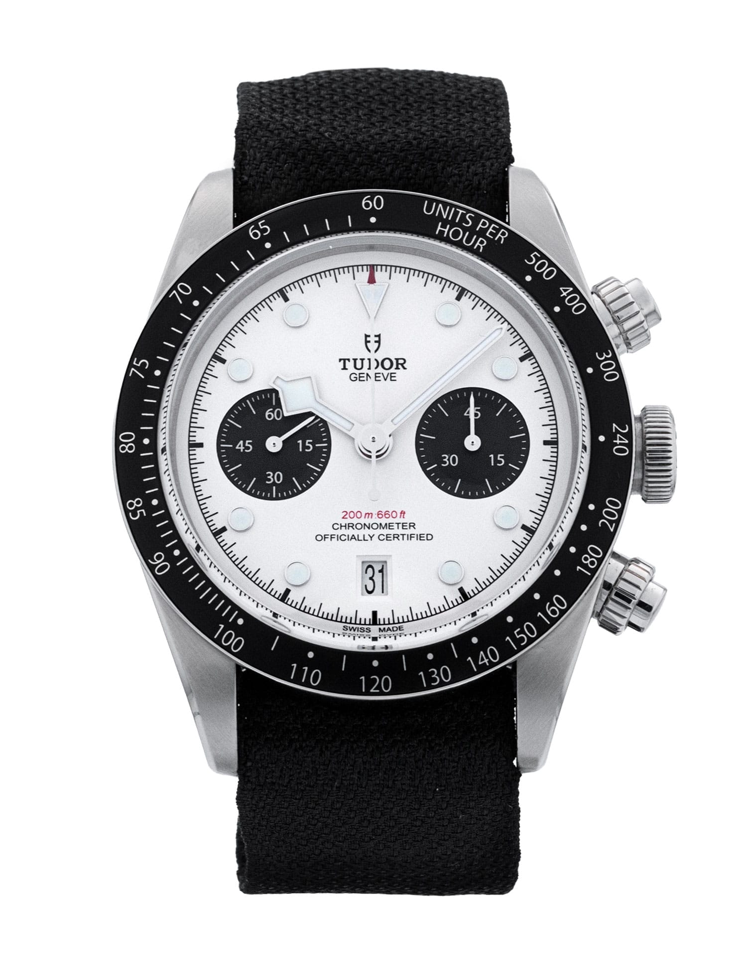 Diese spezifische Tudor Black Bay Chrono M79360N-0008 hat ein weiß ziffernblatt mit einem stoff armband. Diese Tudor wurde einer gründlichen Prüfung der Wasserbeständigkeit, Genauigkeit, Funktionalität und des Zustands unterzogen, um den Grad der Überholung zu bestimmen, der zur Einhaltung unserer strengen Standards erforderlich ist. Sie wurde auch mit technischen Dokumenten und Herstelleraufzeichnungen verglichen, falls vorhanden, um Echtheit und einen einwandfreien Werdegang zu gewährleisten. Damit Sie sich auf unsere Uhren verlassen können, gewähren wir Ihnen eine 24-monatige Garantie. Diese gilt in Verbindung mit jeder eventuell noch bestehenden Herstellergarantie für Neuwaren oder Serviceleistungen. Um die Herstellergarantie für diese Uhr nicht verfallen zu lassen, wurde sie in unserem Servicecenter nicht poliert.